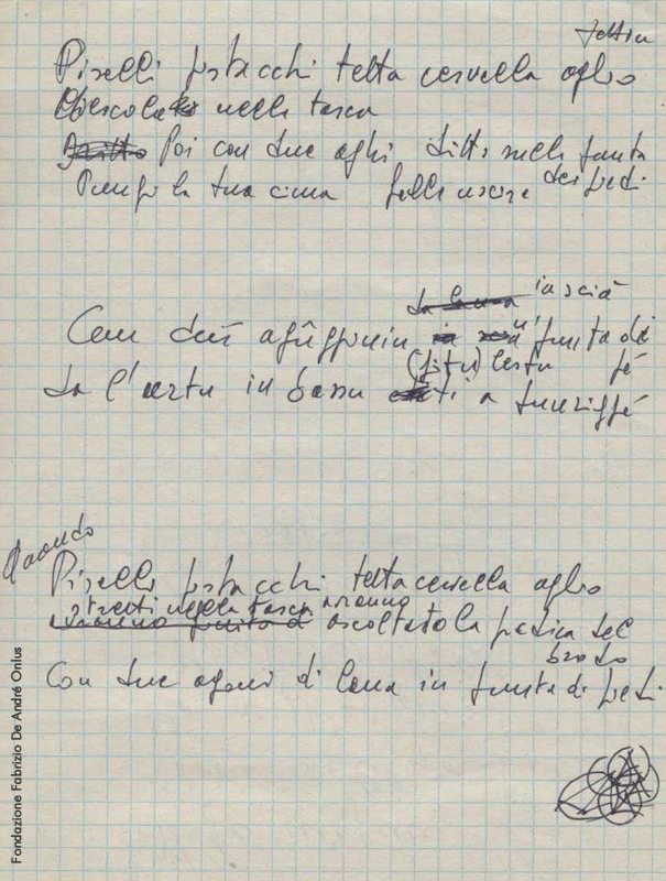 ‘Â çimma e La domenica delle salme; Prinçesa, Dolcenera, Khorakhané… Smisurata preghiera. Dagli autografi di Fabrizio De André, gli appunti con la lavorazione di alcuni brani contenuti negli album Le nuvole e Anime salve.